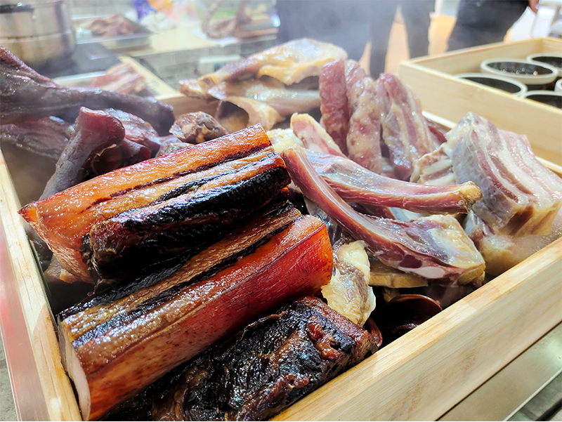 傳統(tǒng)的徽派馬頭墻、一層層懸掛著的徽州刀板香、土香腸、醬肉和風(fēng)干雞等產(chǎn)品,從視覺、嗅覺都讓參加展會(huì)的嘉賓和市民眼前一亮,現(xiàn)場(chǎng)蒸制的產(chǎn)品體驗(yàn)環(huán)節(jié),更是讓臘味展館前排起了長隊(duì),全江臘味的徽派食材展廳成了本屆中國食材電商節(jié)的明星展廳。