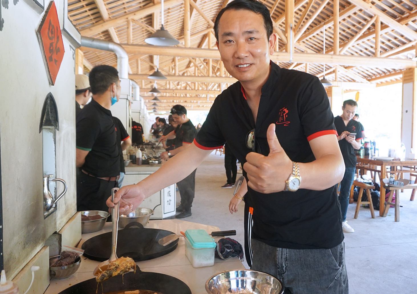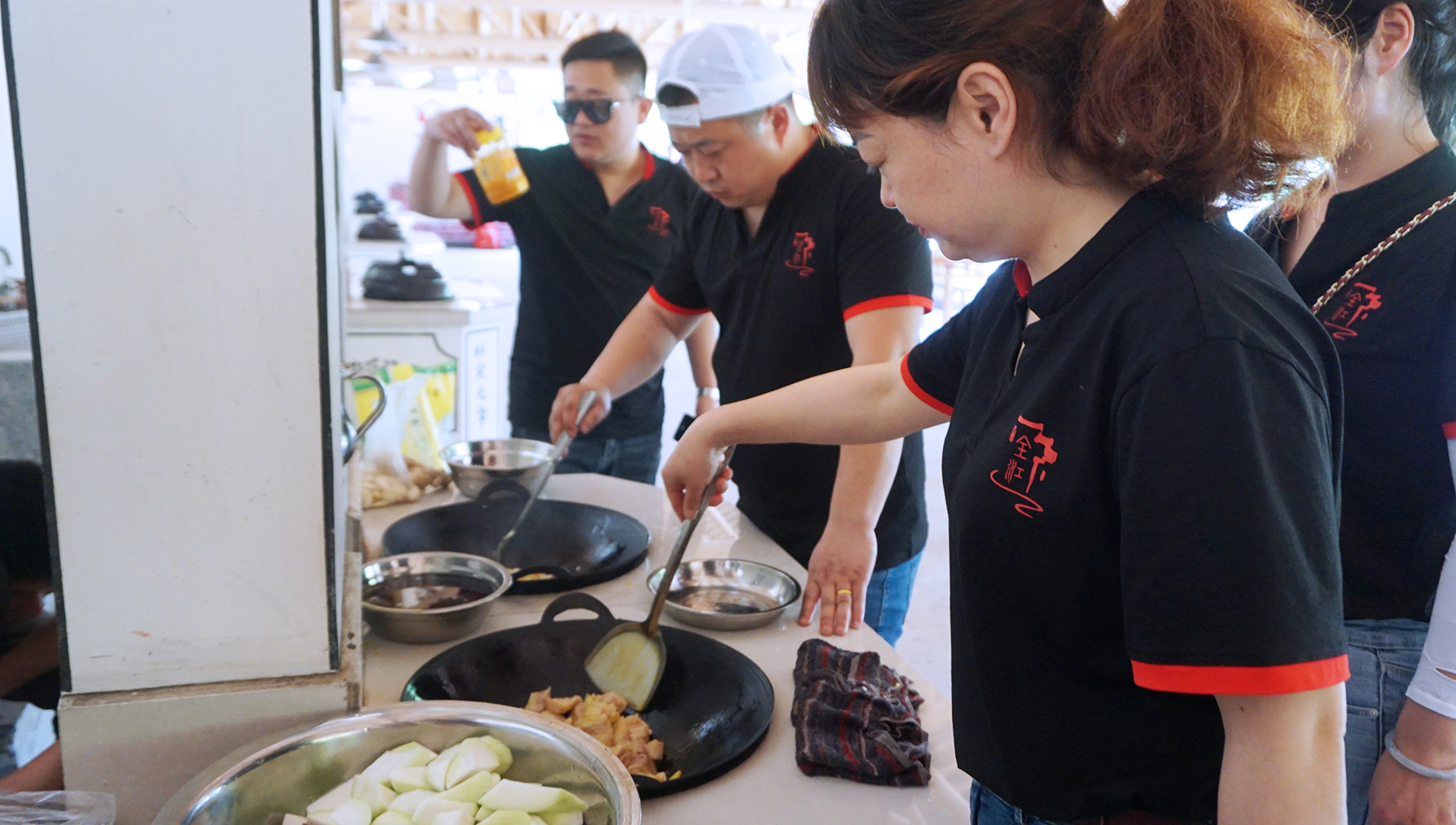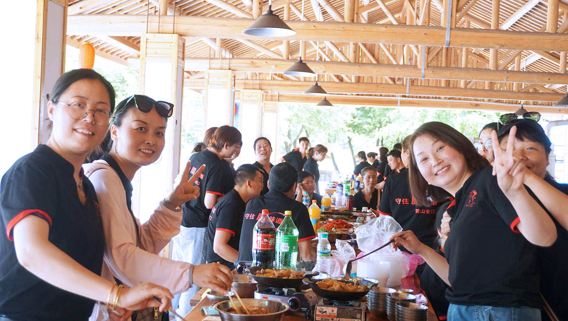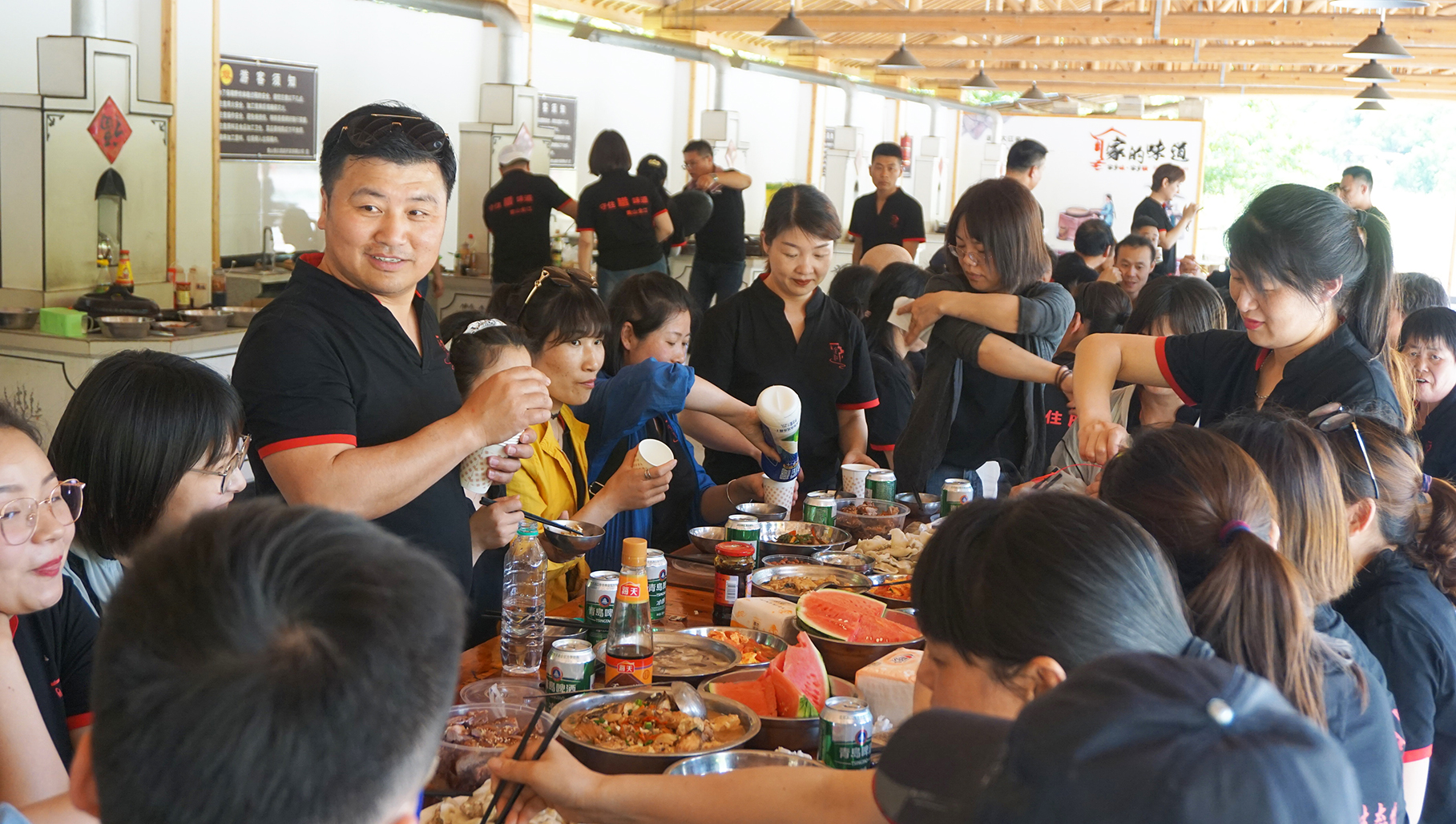 一個(gè)多小時(shí)的忙活,各小組菜終于上齊啦!大功告成,全江的家人們圍在一起,共同干杯,一起享受這頓豐盛的午餐!