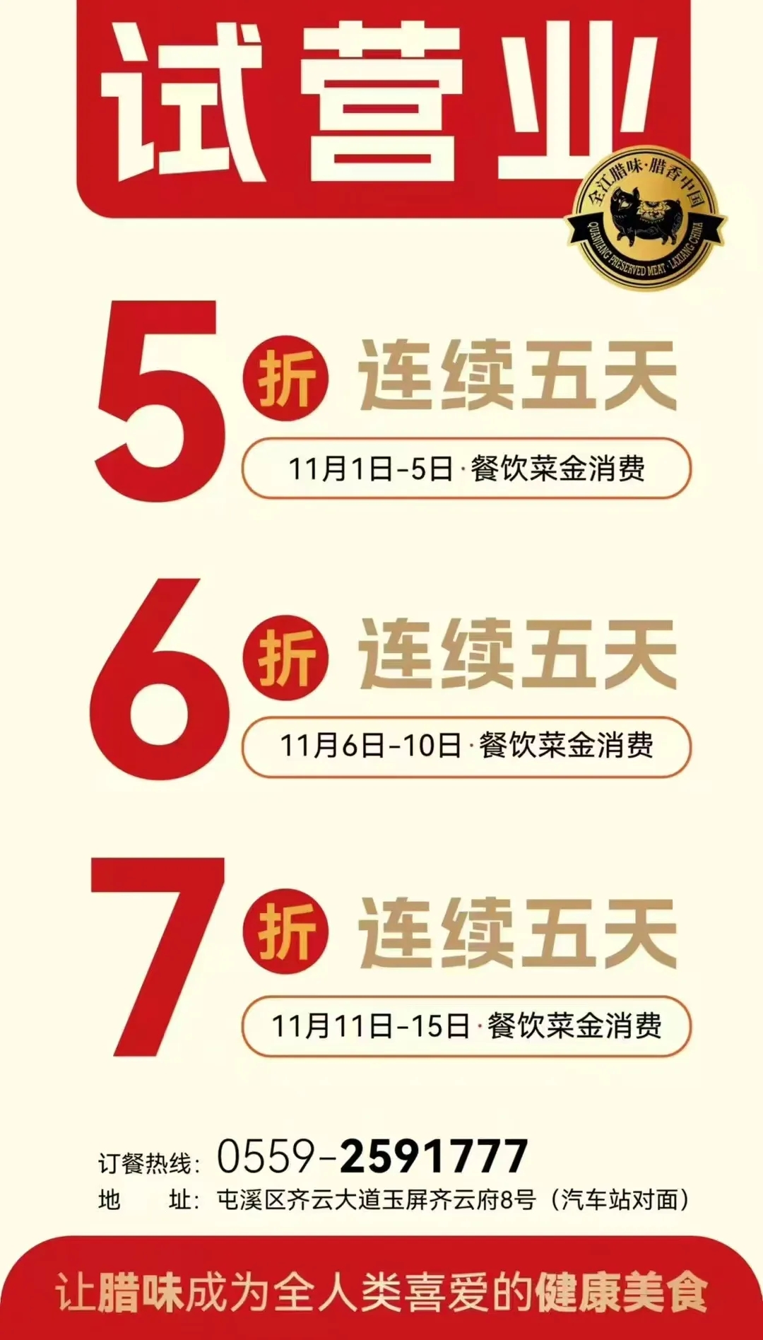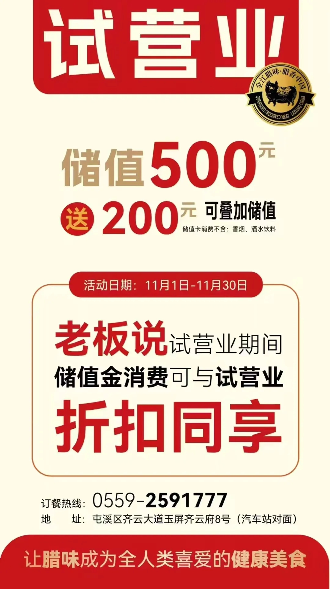 在試營(yíng)業(yè)期間,我們誠(chéng)摯地邀請(qǐng)每一位熱愛美食的顧客蒞臨,共同體驗(yàn)一場(chǎng)前所未有的臘味盛宴。這里,不僅有豐富多樣、風(fēng)味十足的臘味菜品等待著您的品嘗,更有一系列來(lái)自黃山市三區(qū)四縣的地道土菜,讓您在享受傳統(tǒng)臘味的同時(shí),也能領(lǐng)略到不同地域的特色風(fēng)味。
