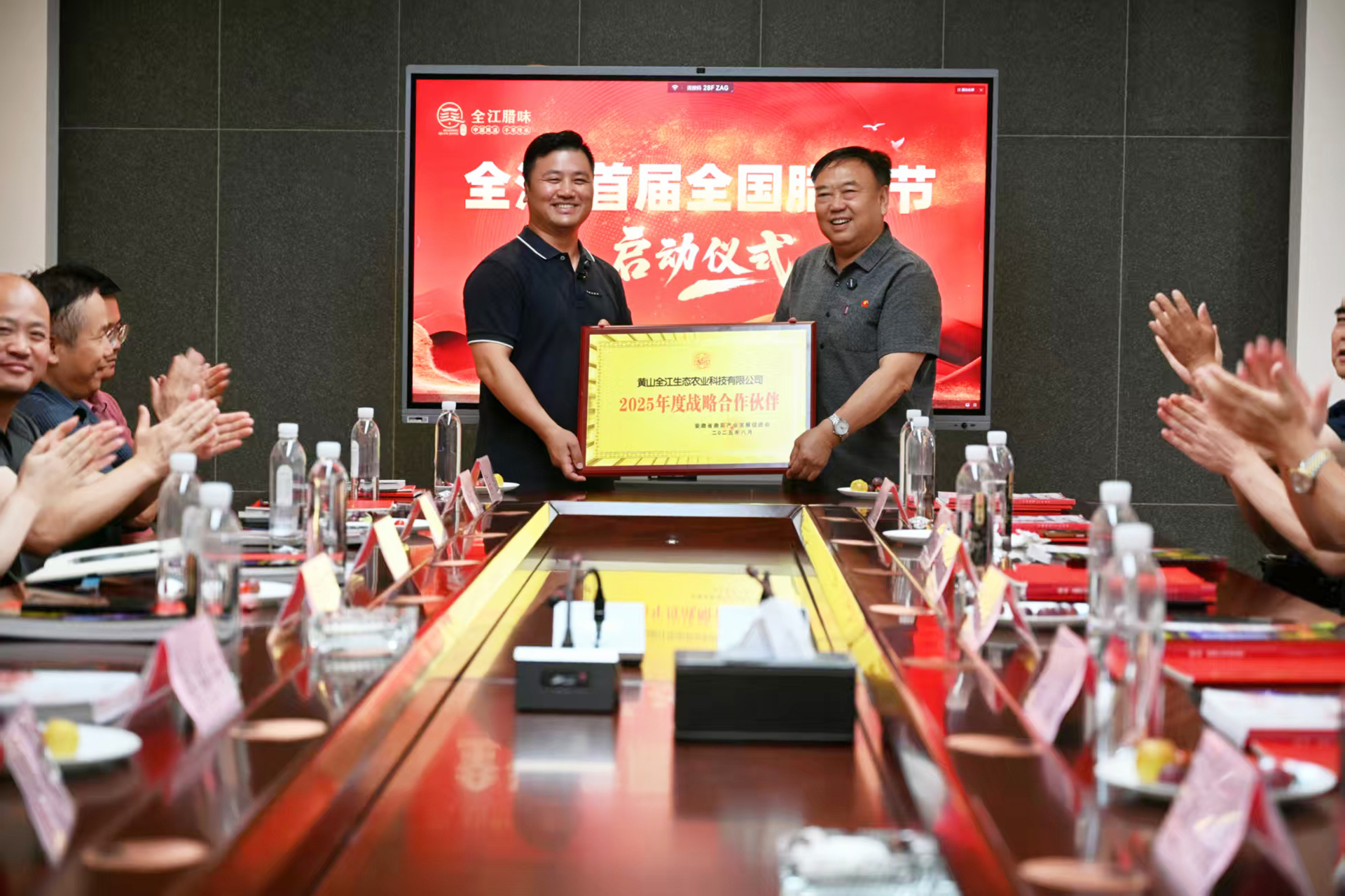 在熱烈的交流探討之后,焦老師親自將“戰(zhàn)略合作伙伴”的牌匾授予全江臘味,并宣布“全江?首屆全國臘味節(jié)正式啟動”!這塊牌匾不僅是一份榮譽,更是一份沉甸甸的責任。
