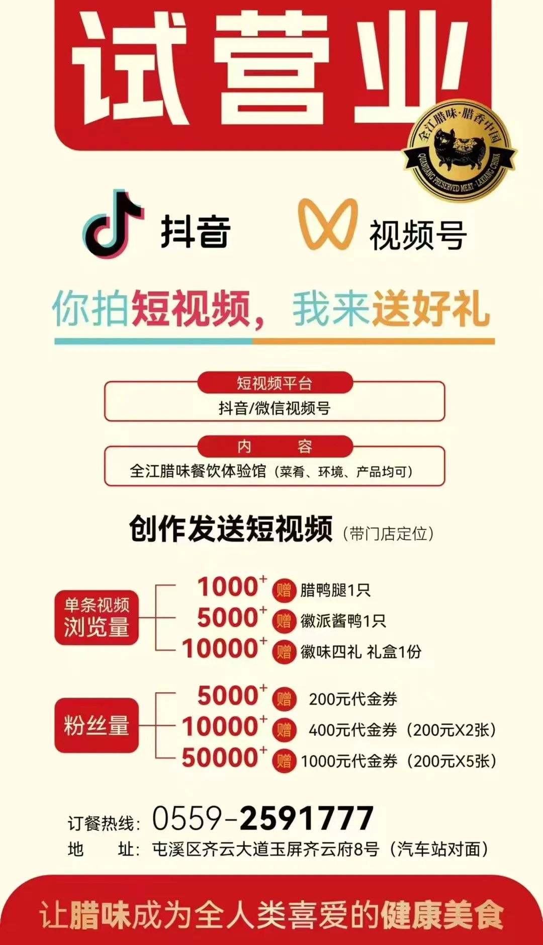 在試營(yíng)業(yè)期間,我們誠(chéng)摯地邀請(qǐng)每一位熱愛美食的顧客蒞臨,共同體驗(yàn)一場(chǎng)前所未有的臘味盛宴。這里,不僅有豐富多樣、風(fēng)味十足的臘味菜品等待著您的品嘗,更有一系列來(lái)自黃山市三區(qū)四縣的地道土菜,讓您在享受傳統(tǒng)臘味的同時(shí),也能領(lǐng)略到不同地域的特色風(fēng)味。